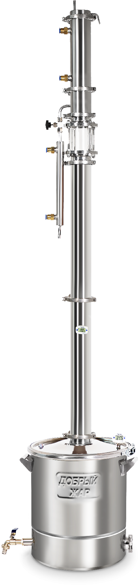 Это важный элемент в конструкции самогонного аппарата, без которого не обойдется ни один современный дистиллятор. Электронный термометр установлен на крышке бака и в узле отбора, что позволяет контролировать температуру восходящих спиртовых паров.